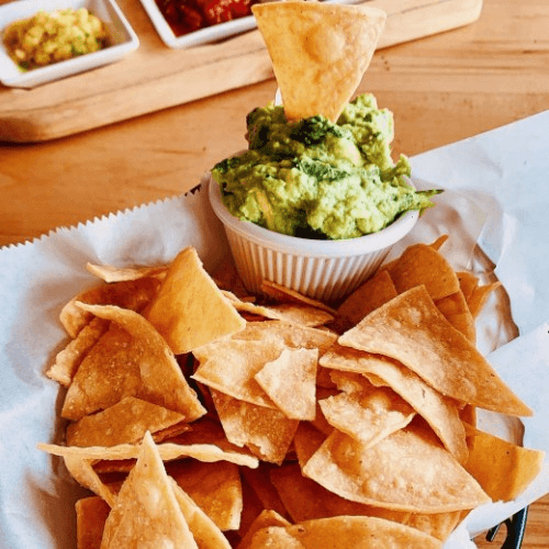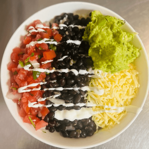 A hearty bowl of rice and black beans, topped with melted Chihuahua cheese, fresh pico de gallo, creamy guacamole, and a drizzle of Mexican crema. Simple, fresh, and satisfying.