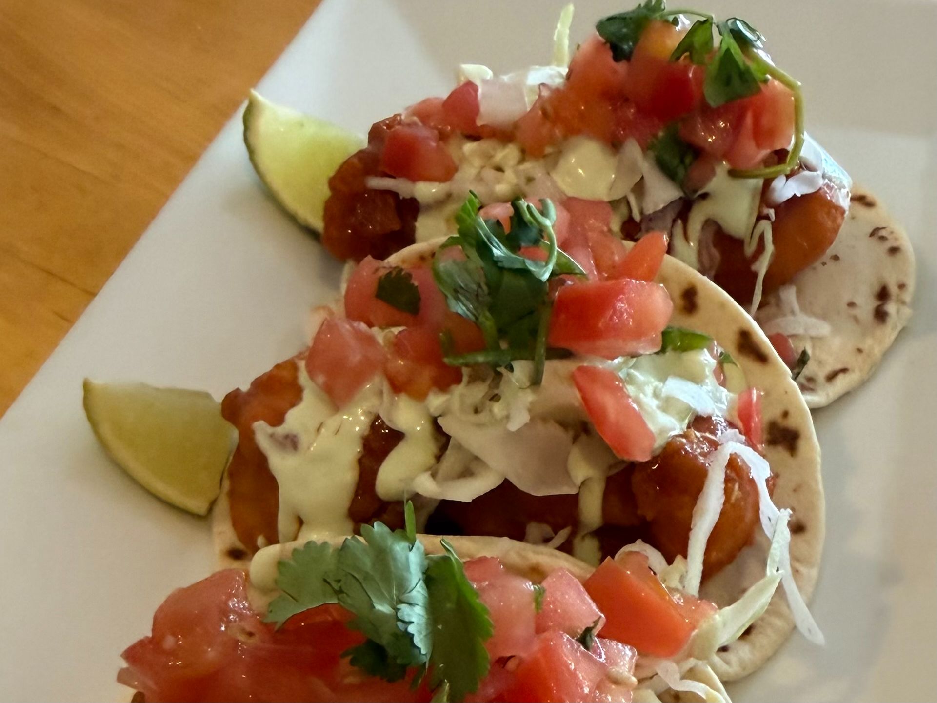 3 Tacos - Battered Shrimp Tossed in Buffalo Sauce, Crispy Green Cabbage, House Made Pico de Gallo, Drizzled with our Signature Lime Cilantro Sauce. 5" Tortillas.
