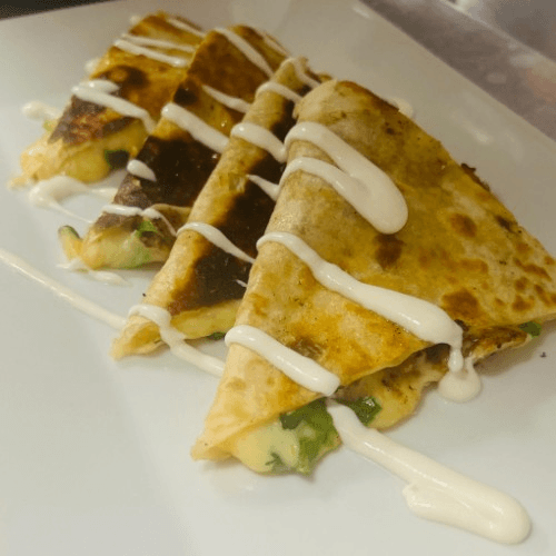 A warm, golden-grilled tortilla filled with tender, grilled chicken, melted cheese, and a hint of savory spice. Crisp on the outside and perfectly gooey inside.
