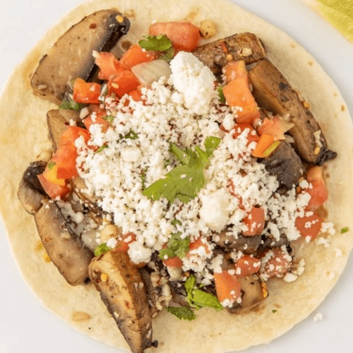 One 6" Flour Tortilla, Sauteed Spicy Portobello Mushrooms, Pico de Gallo, Queso Fresco Cheese,