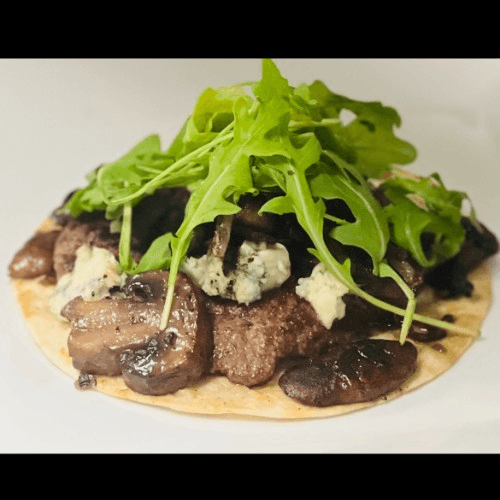 One 6" Flour Tortilla, Certified Angus Beef, Sauteed Shallots & Mushrooms, Blue Cheese, Baby Arugula.