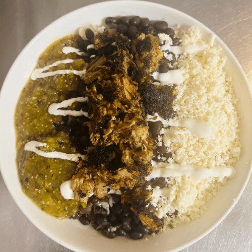 Tender shredded pork served over rice and black beans, topped with tangy salsa verde, crumbled queso fresco, and a drizzle of Mexican crema. Fresh, vibrant, and packed with classic Mexican flavors.