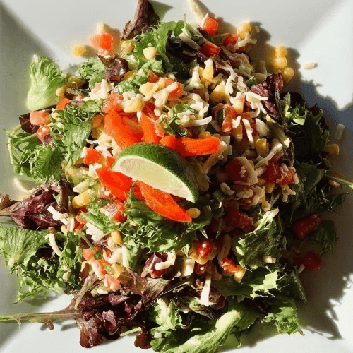 Corn, Shredded Cheese, Roasted Red Peppers, Pico de gallo, Roasted Pumpkin Seeds, Mixed Greens, Cilantro Lime Vinaigrette.