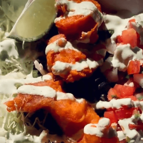 Crispy battered buffalo shrimp served over warm rice and black beans, topped with fresh green cabbage and vibrant pico de gallo. Finished with our cool, zesty lime-cilantro sauce for the perfect balance of heat, crunch, and refreshing flavor.