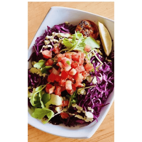 Grilled Mahi Mahi, Corn, Shredded Cheese, Roasted Red Peppers, Pico de gallo, Roasted Pumpkin Seeds, Mixed Greens, Cilantro Lime Vinaigrette.