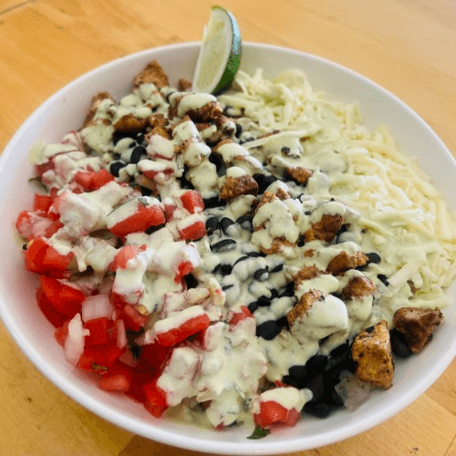 Grilled chicken served over warm rice and black beans, topped with melty Chihuahua cheese and fresh pico de gallo. Finished with our bright, zesty lime-cilantro sauce for a simple, satisfying, flavor-packed bowl.